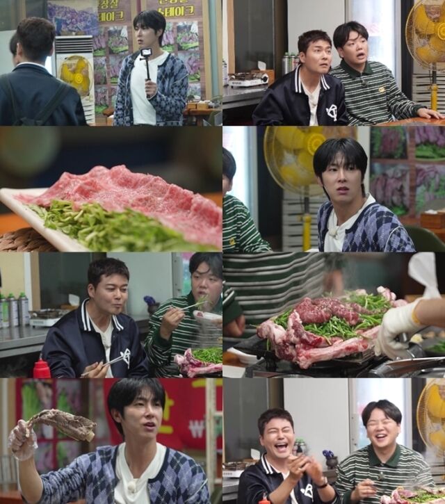 난생처음 경험한 '살치살 육사시미'에 감탄하며 세 사람이 먹방에 돌입했지만, 이후로도 미나리 소갈비뼈 불판, 철판 살치살&안창살 스테이크, 갈비 전골, 도가니탕이 끊임없이 서빙되었습니다. 끝을 모르는 한우의 향연에 세 사람은 행복한 비명을 질러야 했습니다.